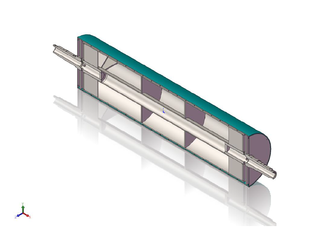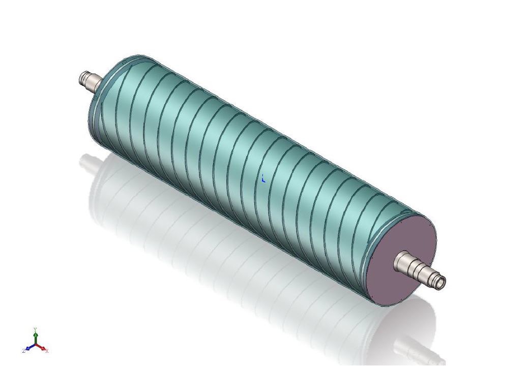 雙流道大直徑流延主冷輥,包括輥筒、進水導流器、出水導流器,進水軸頭管和出水軸頭管,輥筒包括外筒、與外筒同軸設置的內(nèi)筒和在外筒、內(nèi)筒之間設置的多個螺旋導流片,相鄰兩個螺旋導流片構成一個螺旋導流槽,進水導流器、出水導流器分別固定連接在輥筒的兩端,進水軸頭管和出水軸頭管分別安裝在進水導流器、出水導流器上。大直徑流延主冷輥,結構簡單,由于設置了進水導流器和出水導流器,可有效降低主冷輥內(nèi)部的流動阻力,能夠使得流入輥筒內(nèi)的冷卻水量更加均勻,提高主冷輥的送水能力,提高主冷輥冷卻效率,有效提高輥筒表面的溫度均勻性,節(jié)約能耗。